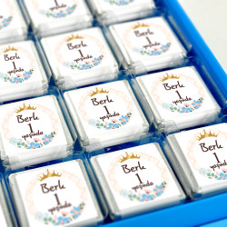 Erkek bebeklere özel 340g'lık pakette 48 adet sütlü madlen çikolata bulunmaktadır. Madlen çikolataların üzerine bebeğinizin adı etiket olarak yapıştırılmaktadır.