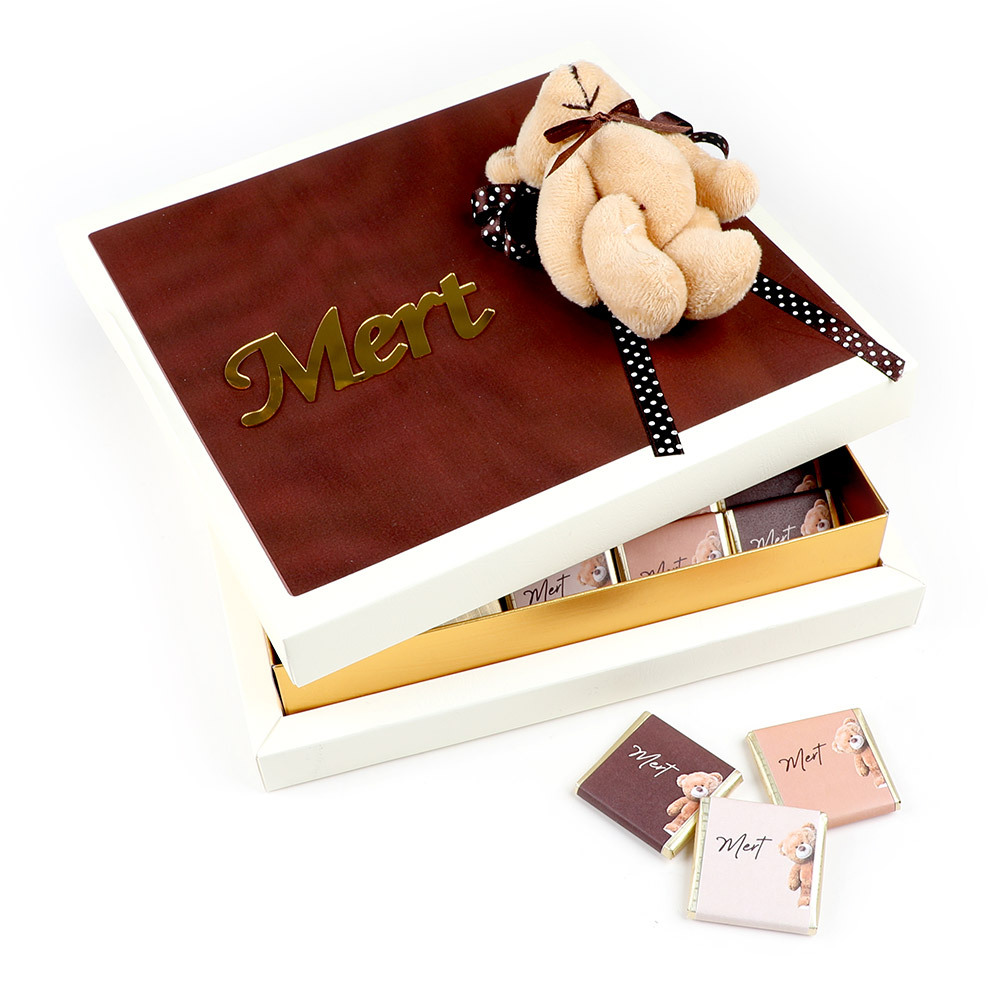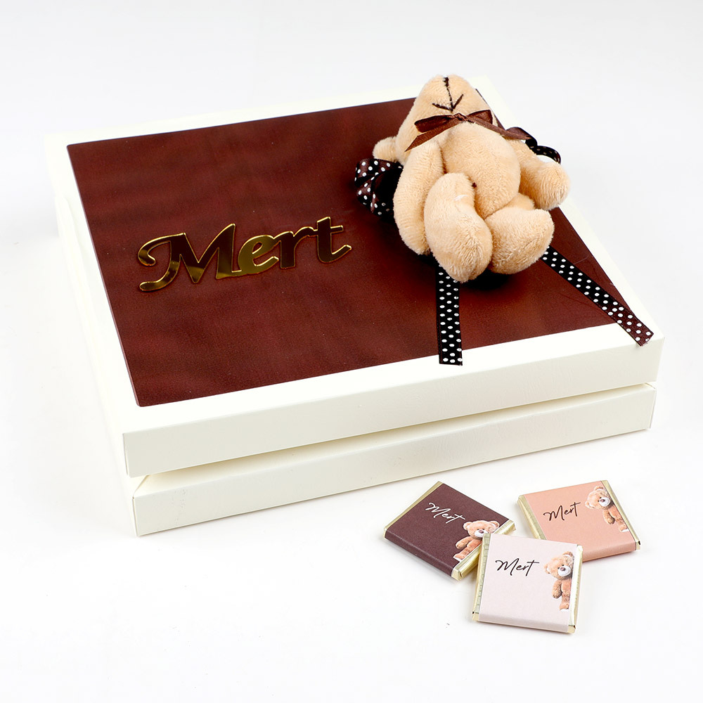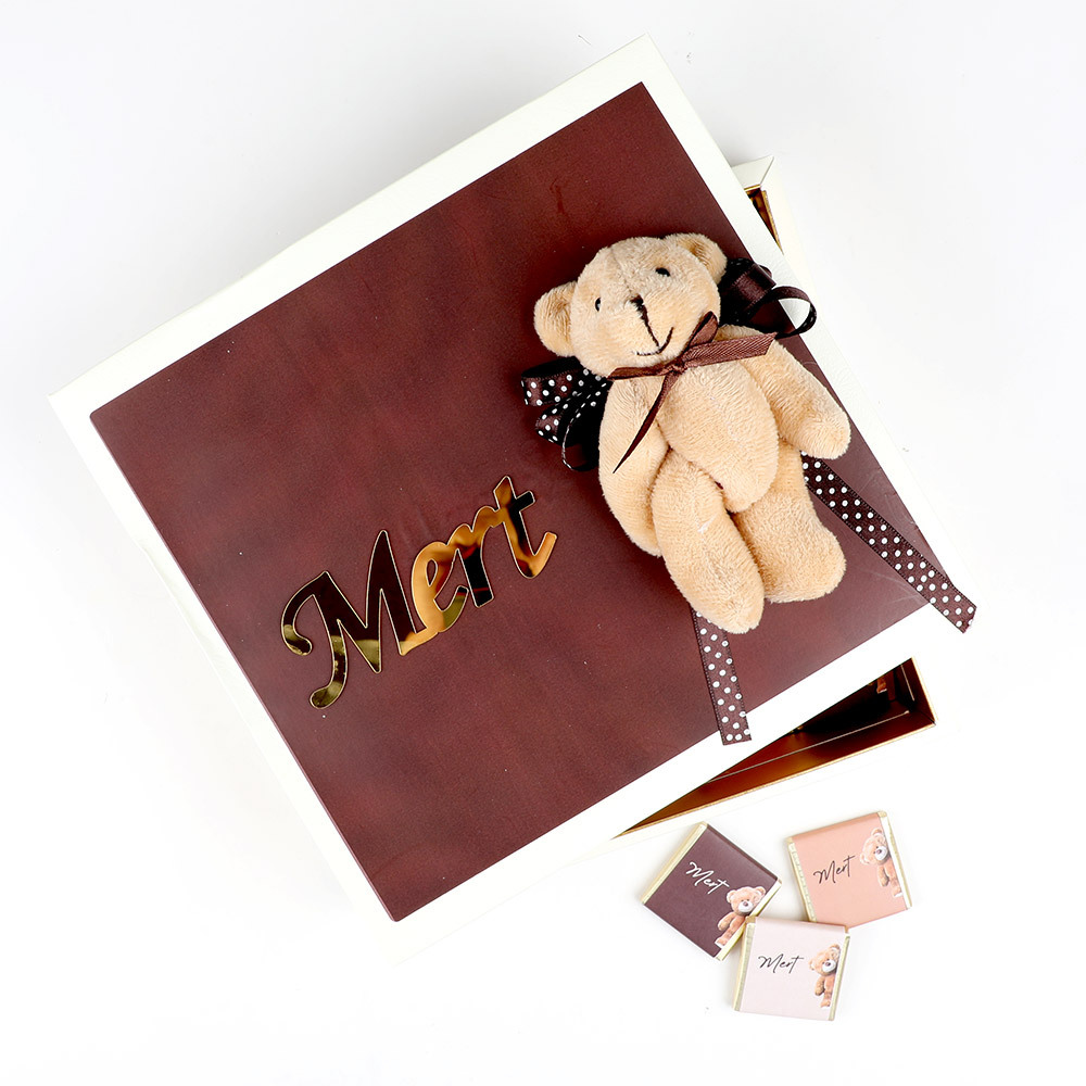 Kutu kapak üzerinde ayıcık dekoru ve pleksi isim.