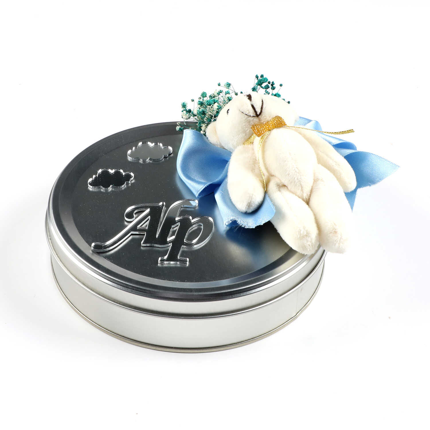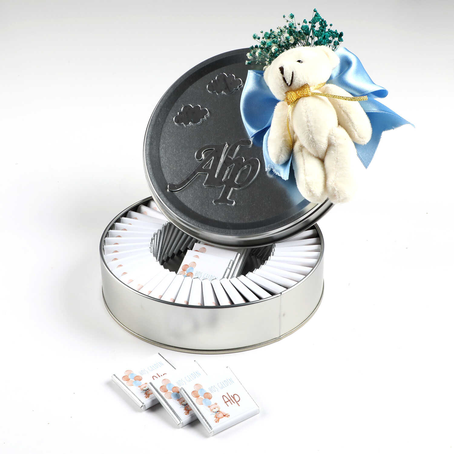 Ayıcık Figürlü Erkek Bebek Çikolatası (Metal Yuvarlak Kutu) 50 Adet Madlen