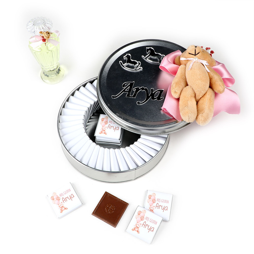Ayıcık Figürlü Kız Bebek Çikolatası (Metal Yuvarlak Kutu) 70 Adet Madlen+Kolonya Hediyeli