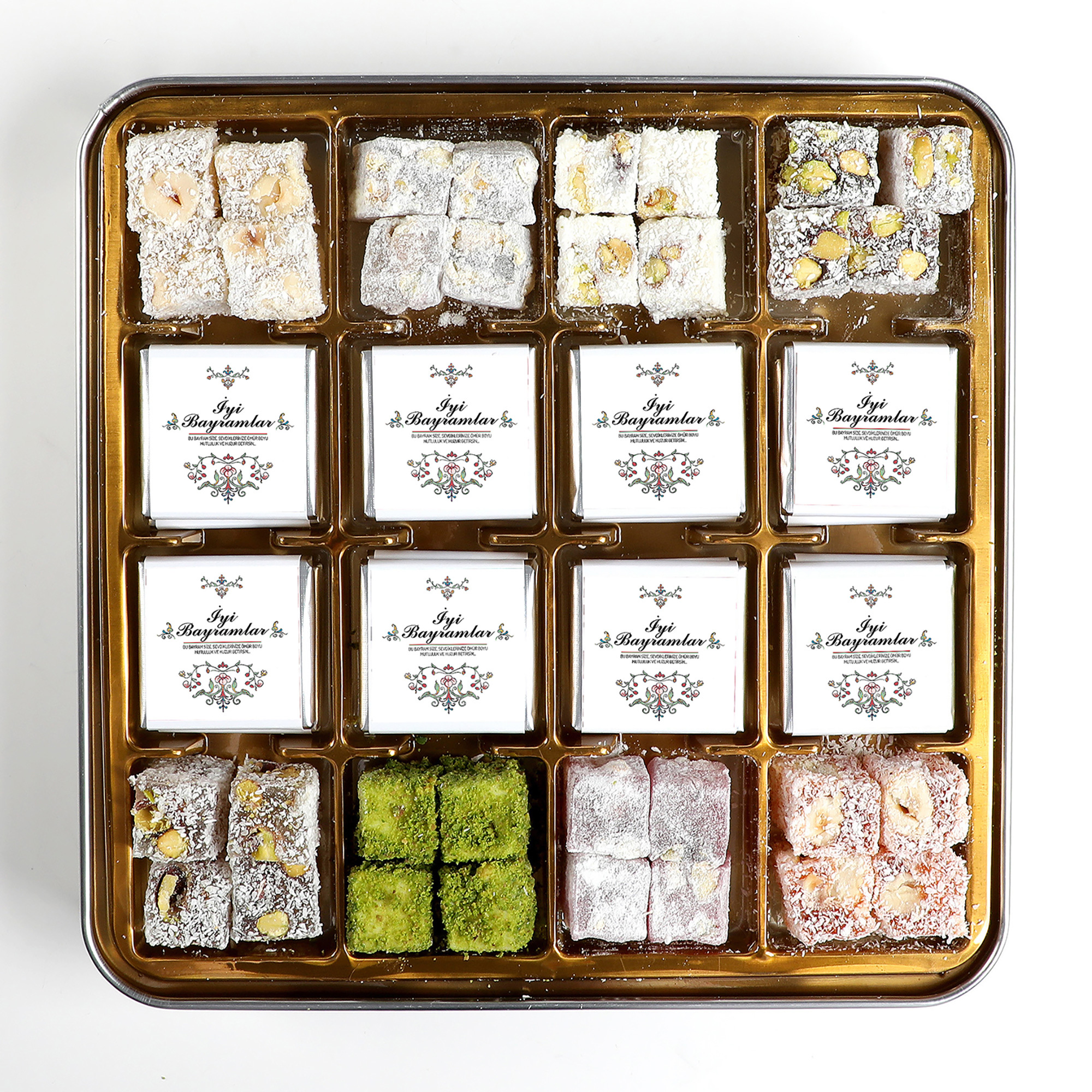 Kapak ve madlen çikolatalar üzerinde "İyi Bayramlar - Bu bayram size, sevdiklerininize ömür boyu mutluluk ve huzur getirsin" mesajı bulunmaktadır.