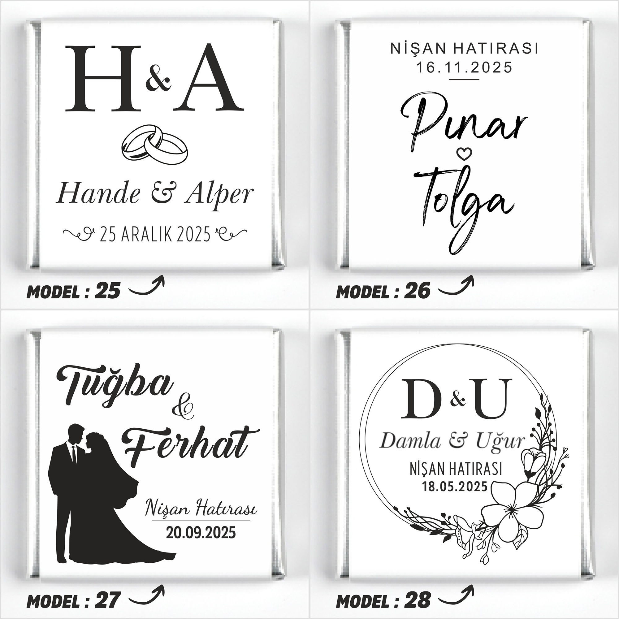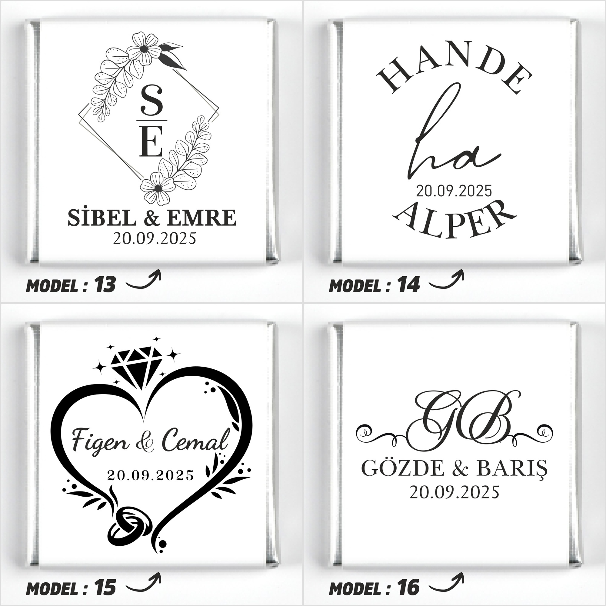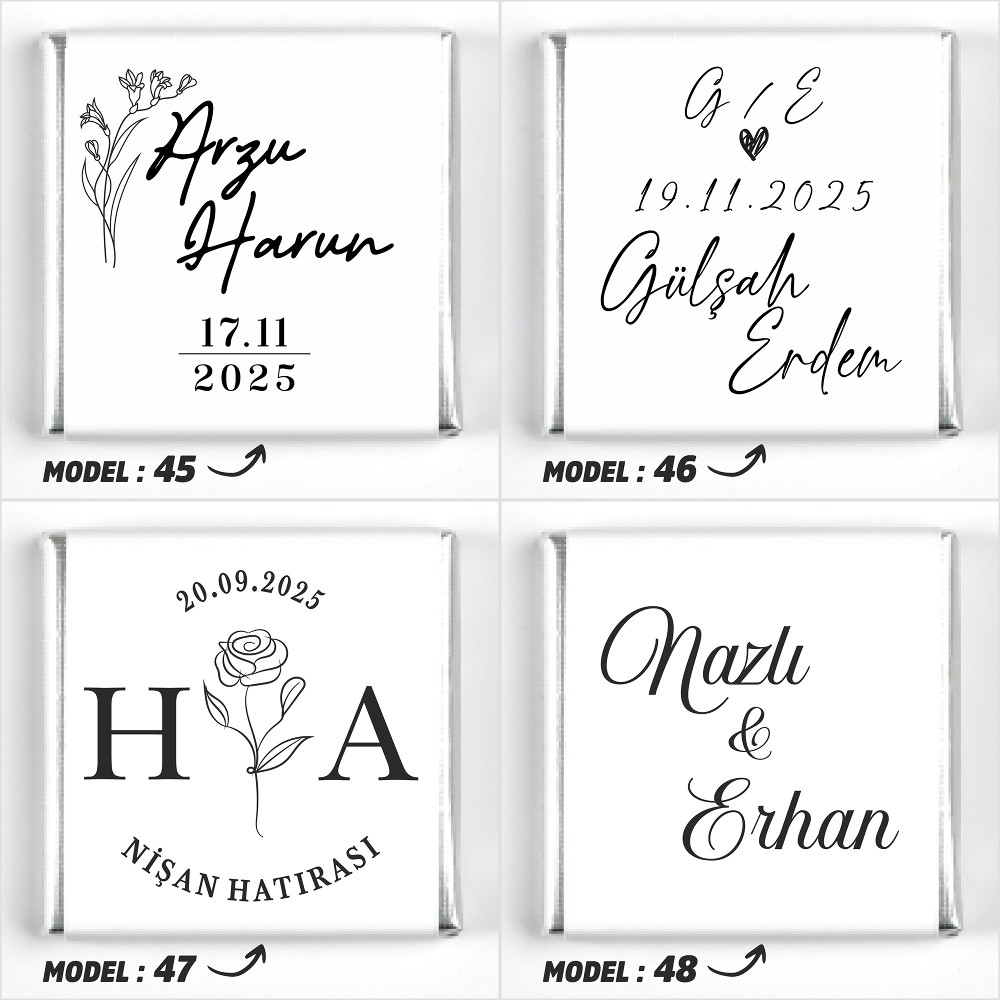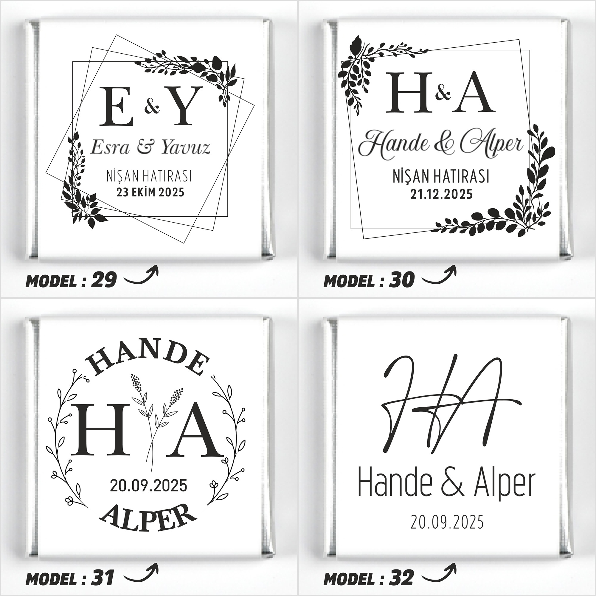 İsimlerinizi, tarih bilgisini ve model seçimini ürün sayfasındaki ilgili kutucuklara yazınız.