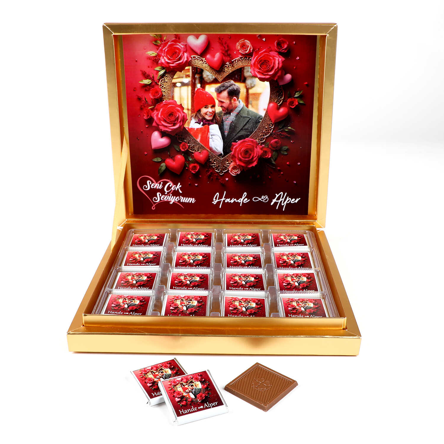 32 adet sütlü madlen çikolata (Toplam 220g) üzerine "Seni Çok Seviyorum" mesajı ve kalp içinde fotoğrafınız yapıştırılarak Gönderilir.