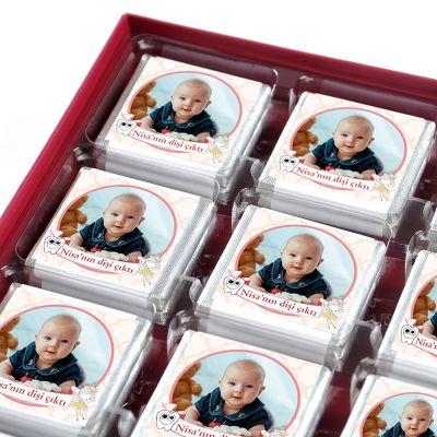 Bebeğinizin ilk dişi için fotoğraflı ve isimli 32 adet madlen çikolata sunum kutulu