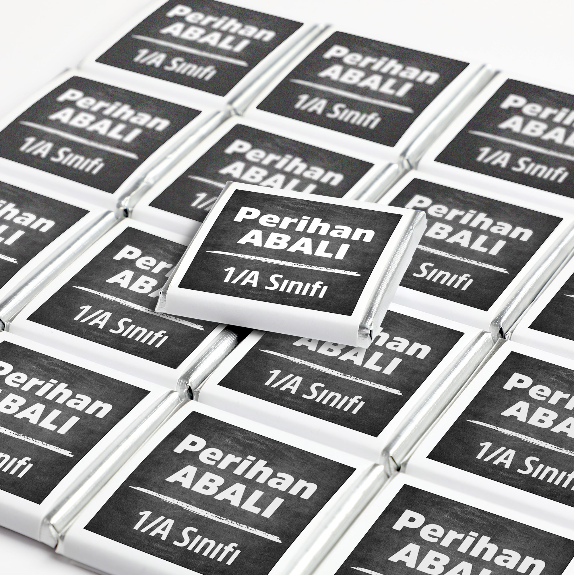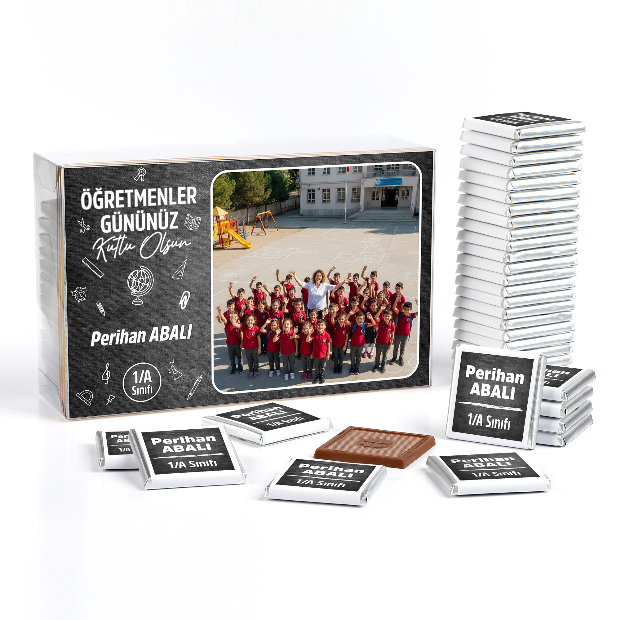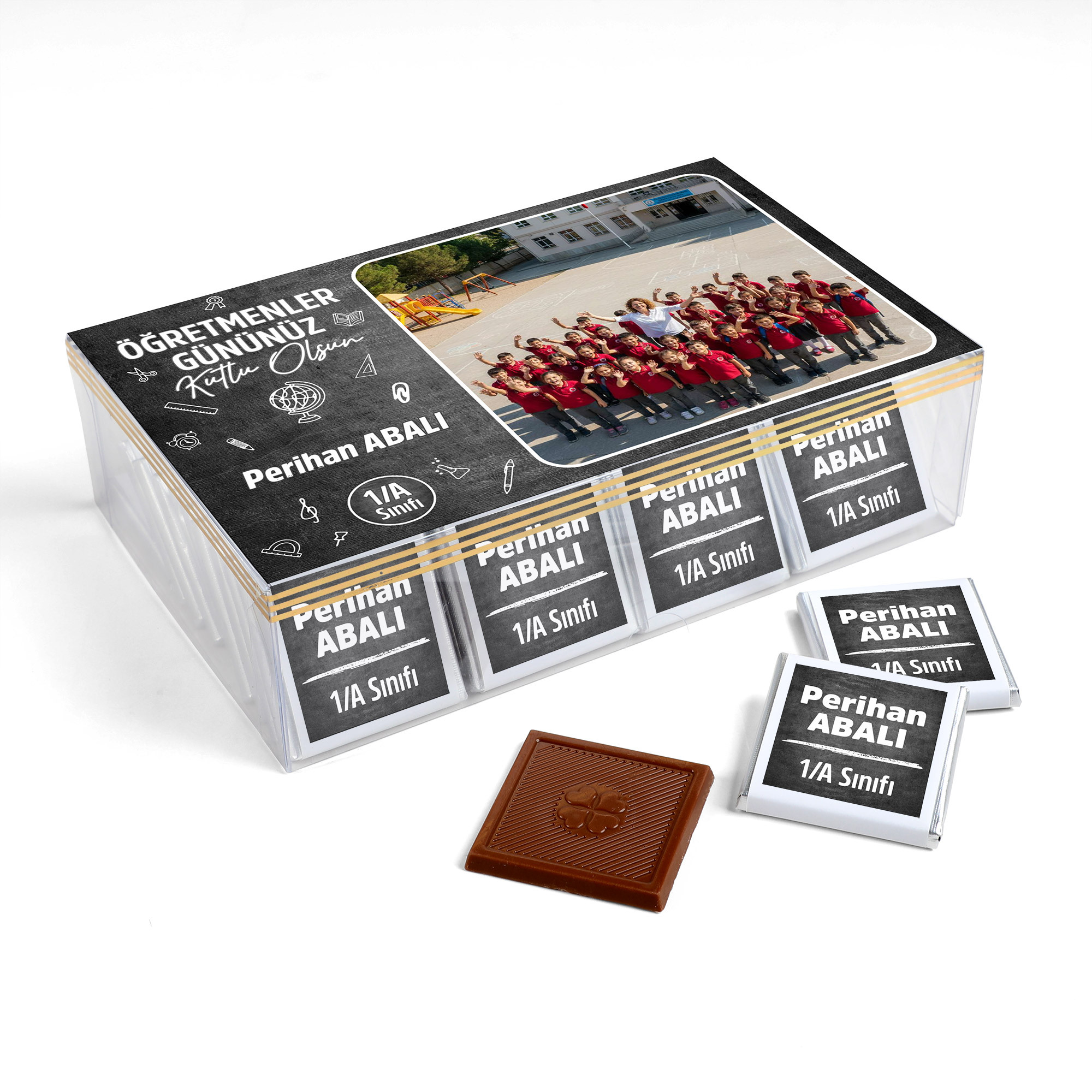 Asetat kapak bölümünde yükleyeceğiniz fotoğraf ve "Öğretmenler Gününüz Kutlu Olsun" mesajı ayrıca Öğretmeninizin ismi ve sınıf eklenir. Madlen çikolatalar üzerine öğretmenin ismi ve sınıf yazılır.