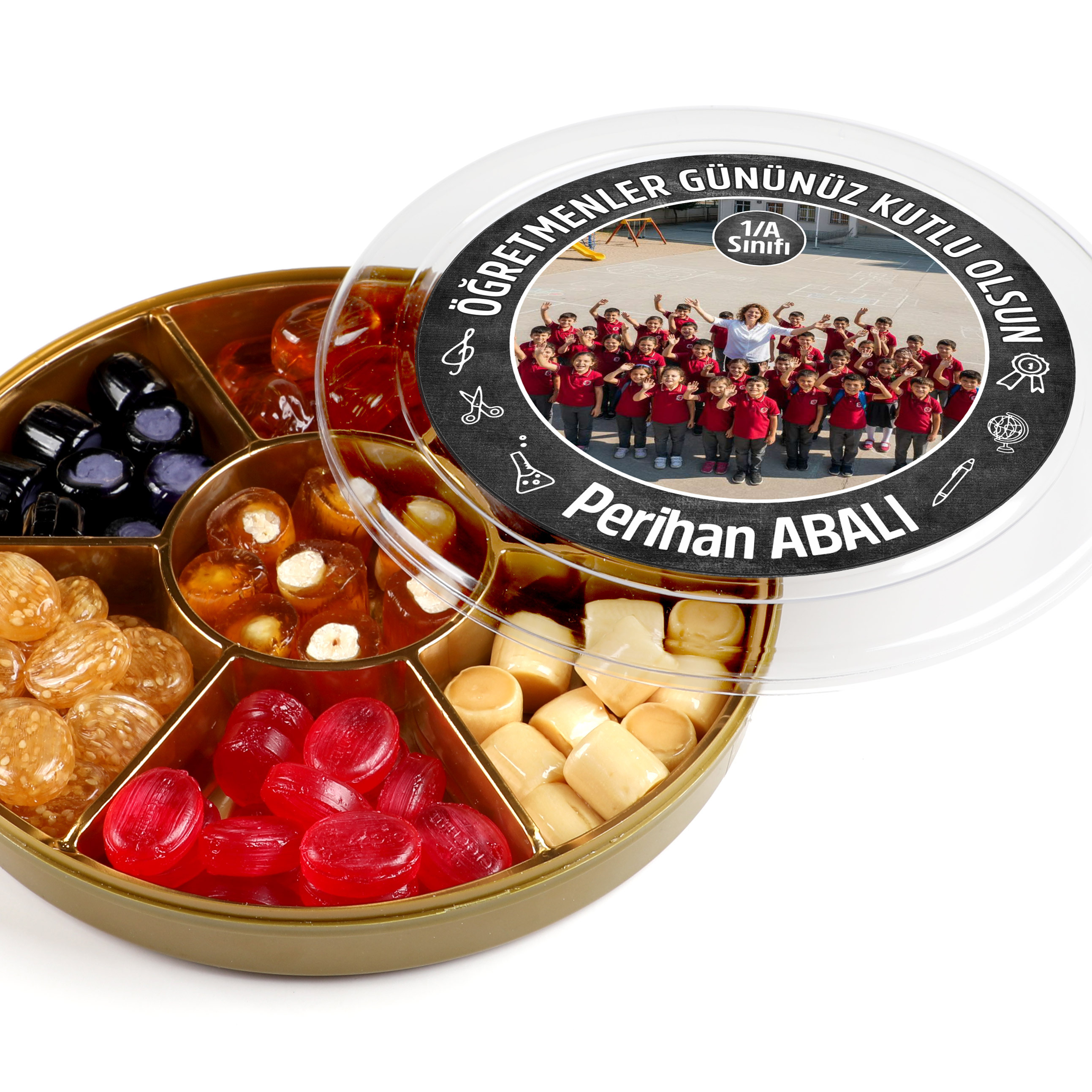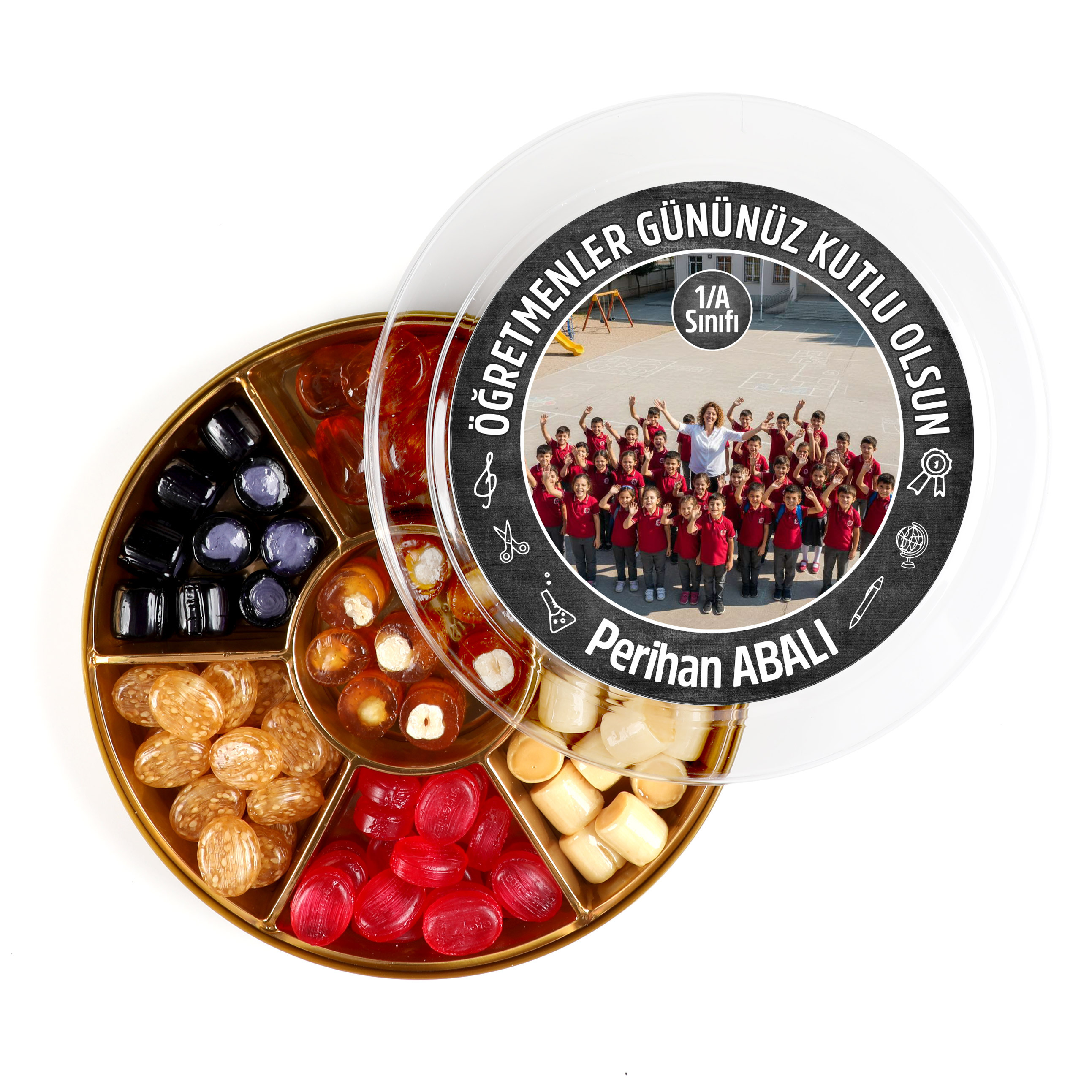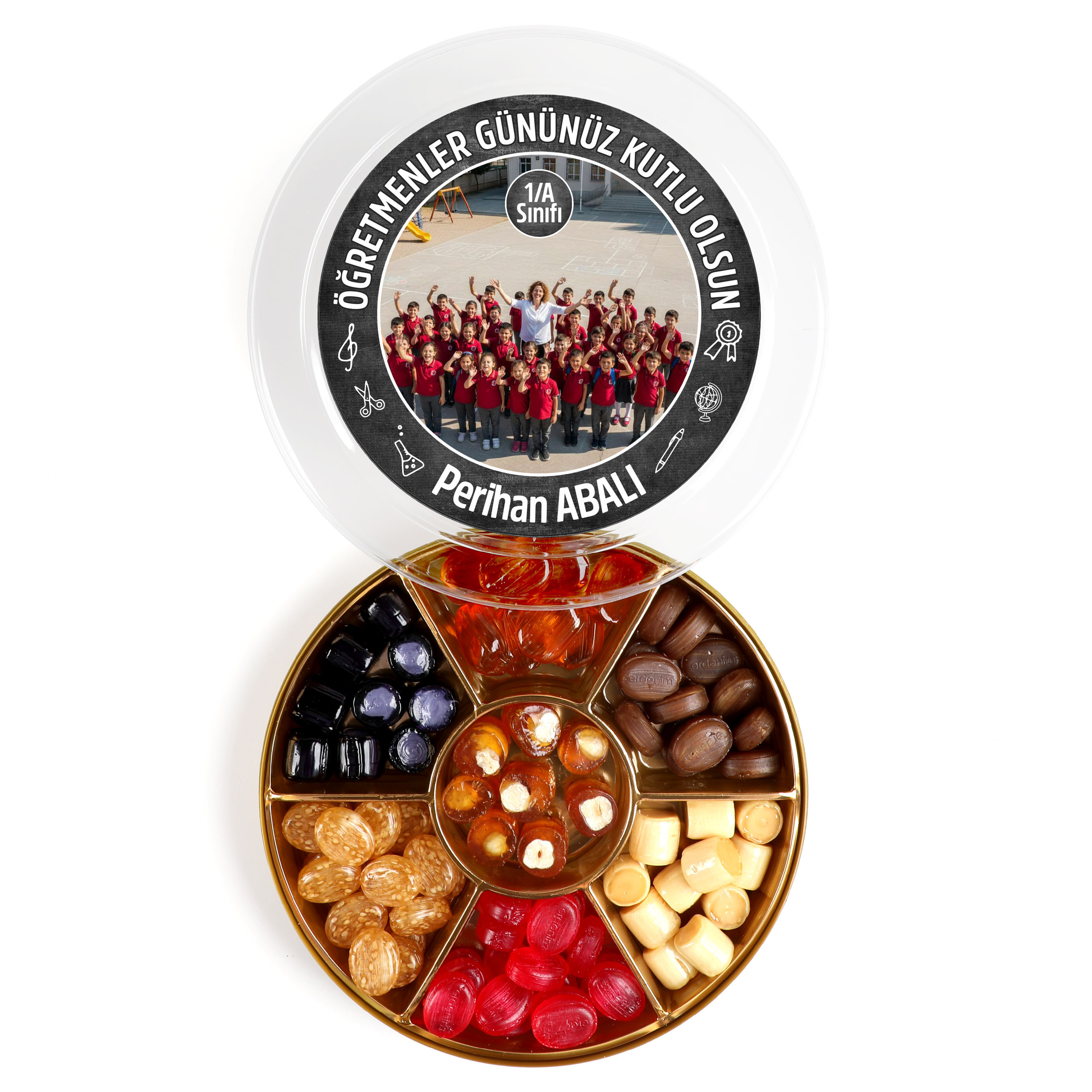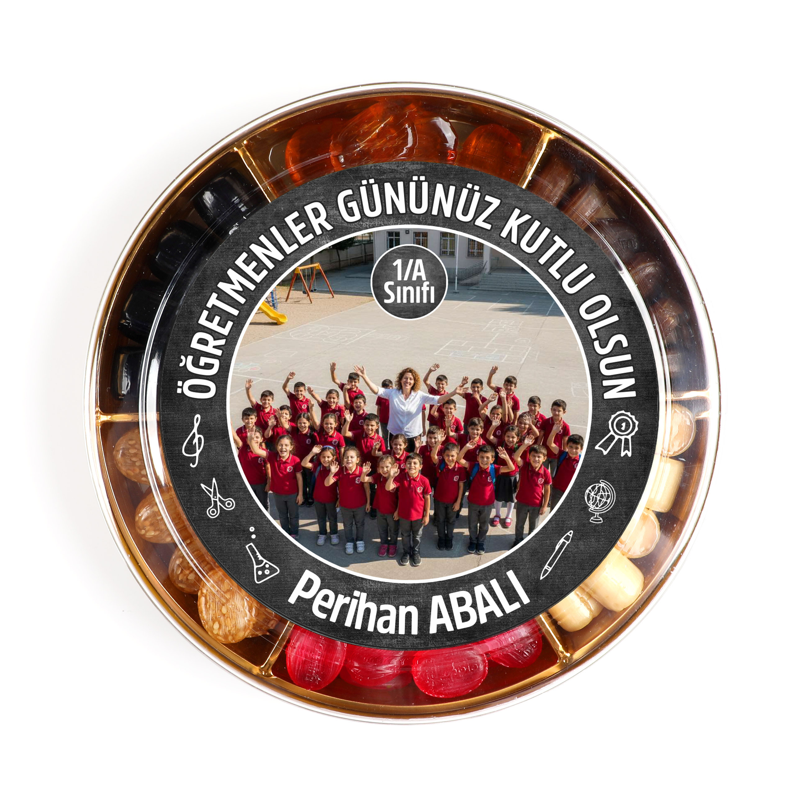 Gelince Haber Verİçerik : Yuvarlak kutuda Karışık Akide Şekeri kapak ü zerinde Öğretmenler Gününe özel çalışması ile birlikte gönderilir.