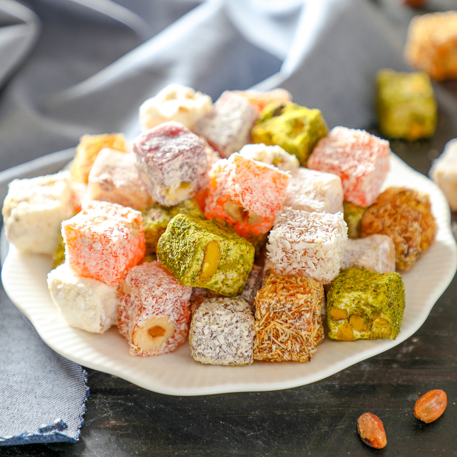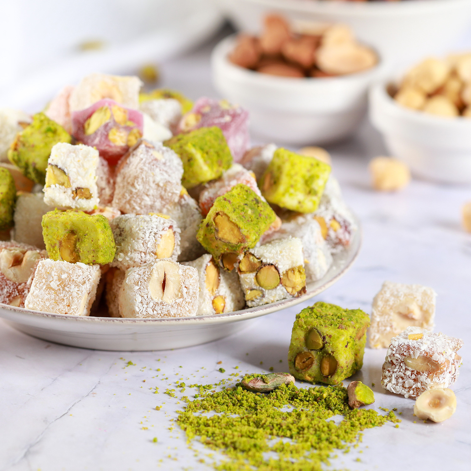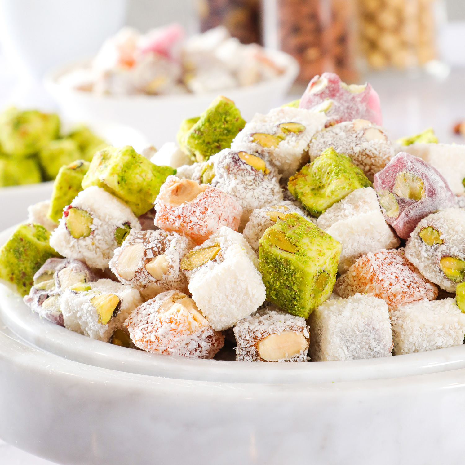 Ürün İçeriği : Şeker, Su, Mısır Nişastası, Asitlik Düzenleyici Sitrik Asit (E 330) Çeşidine Göre (%15 Fındık,%12 Ant. Fıstığı, %15 Badem, %15 Yer Fıstığı, Hindistan Cevizi, Kakao, Nar suyu, Çöven Suyu),Aroma Vericisi(Nar,Portakal),Gıda Renklendiricisi(Kırmızı Turp Ekstraktı,,Kurkumin(E 100) içerir.) Ürün üzeri çeşidine göre (Antep fıstığı, Hindistan cevizi, Pudra şekeri, Kadayıf, Susam) kaplıdır.