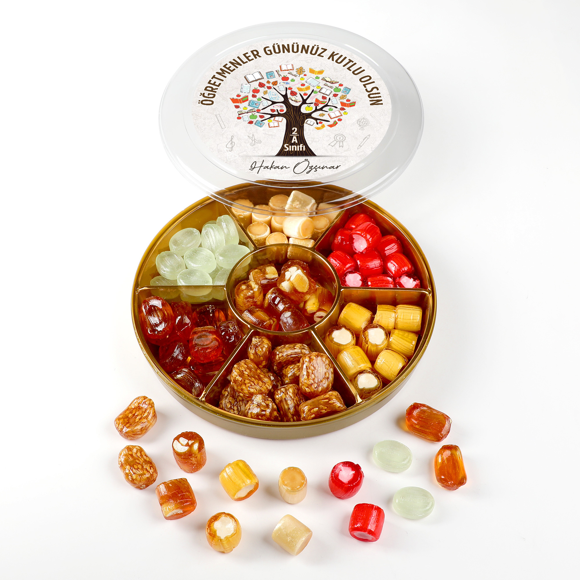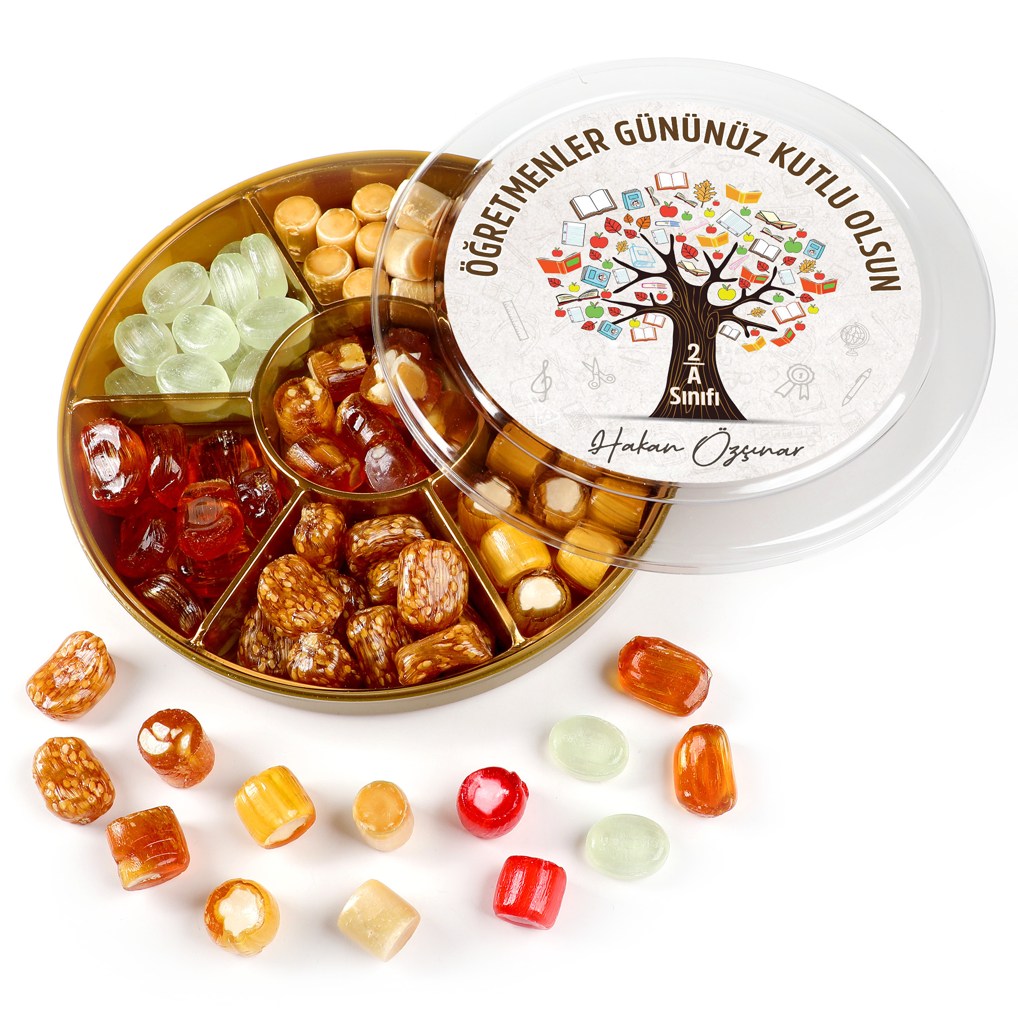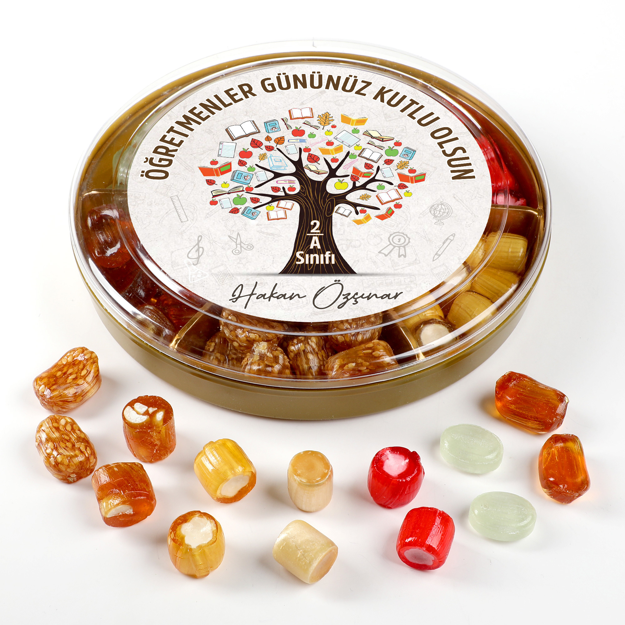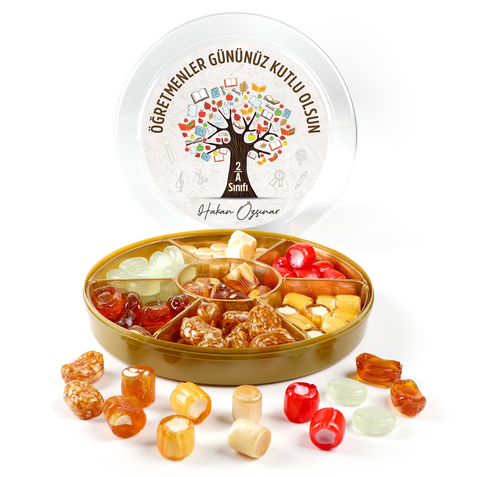 Gelince Haber Verİçerik : Yuvarlak kutuda Karışık Akide Şekeri kapak üzerinde Öğretmenler Gününe özel çalışması ile birlikte gönderilir.