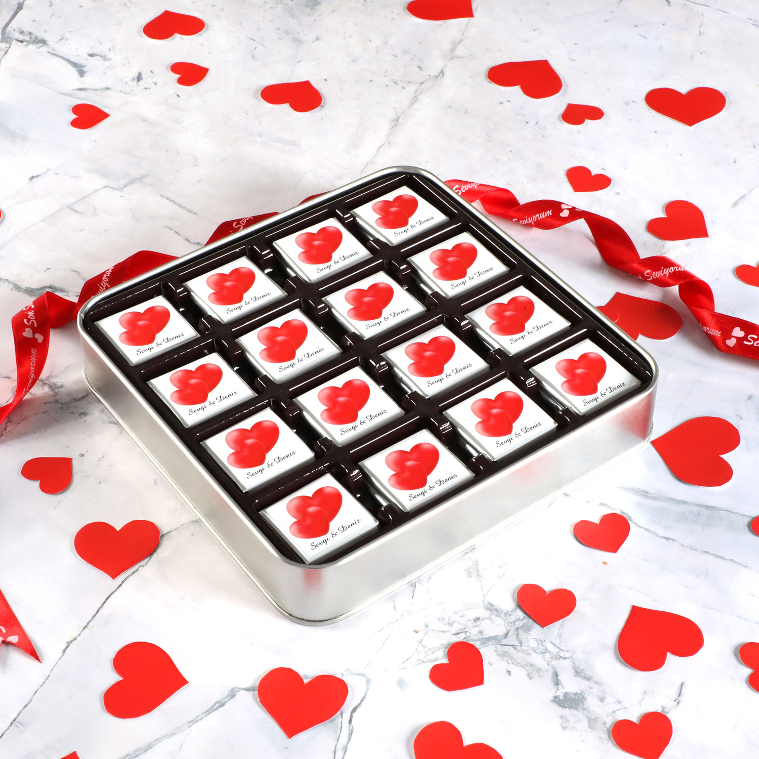 Çikolataların üzerindeki etikette isim yazılmasını istiyorsanız, ürün sayfasındaki isimler bölümüne veya isim ve tarih bilgilerini sepet sayfasındaki sipariş notu bölümüne ekleyebilirsiniz.