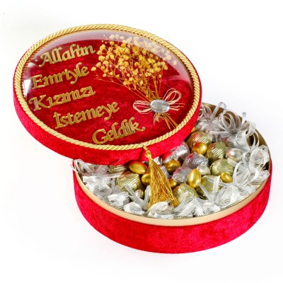 Kutu üzerinde pileksiden 'Allah'ın Emri ile Kızınızı İstemeye Geldik' yazısı ve çiçek süslemesi vardır. Üstü cam ile kaplıdır.