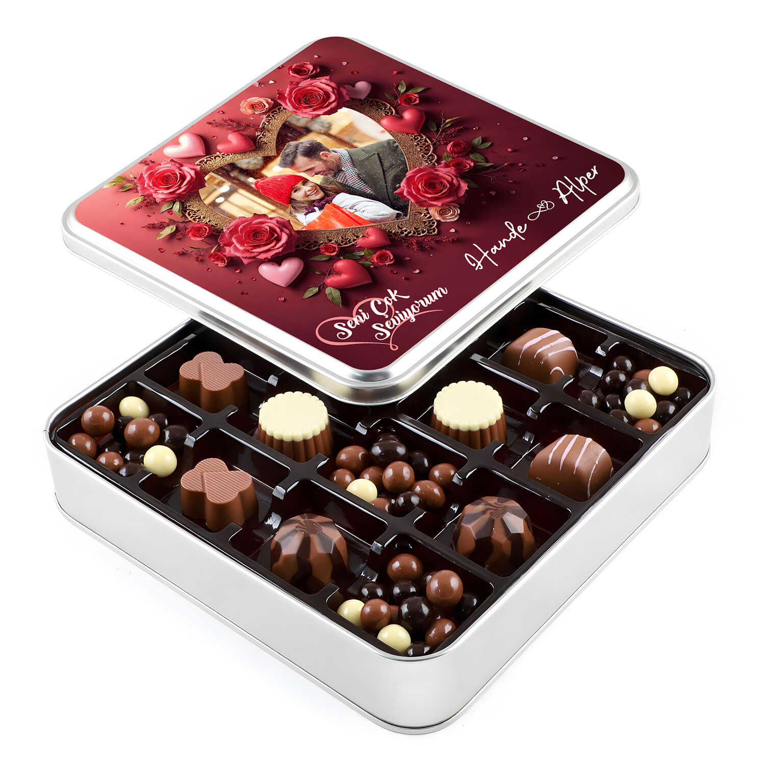 Gelince Haber VerKapak üzerine "Seni Çok Seviyorum" mesajı ile birlikte Göndermiş Olduğunuz Fotoğraf ve isimler Eklenerek Gönderim Yapılır. Fotoğraf ürün resmindeki gibi kalp temalı çalışma içine yerleştirilir