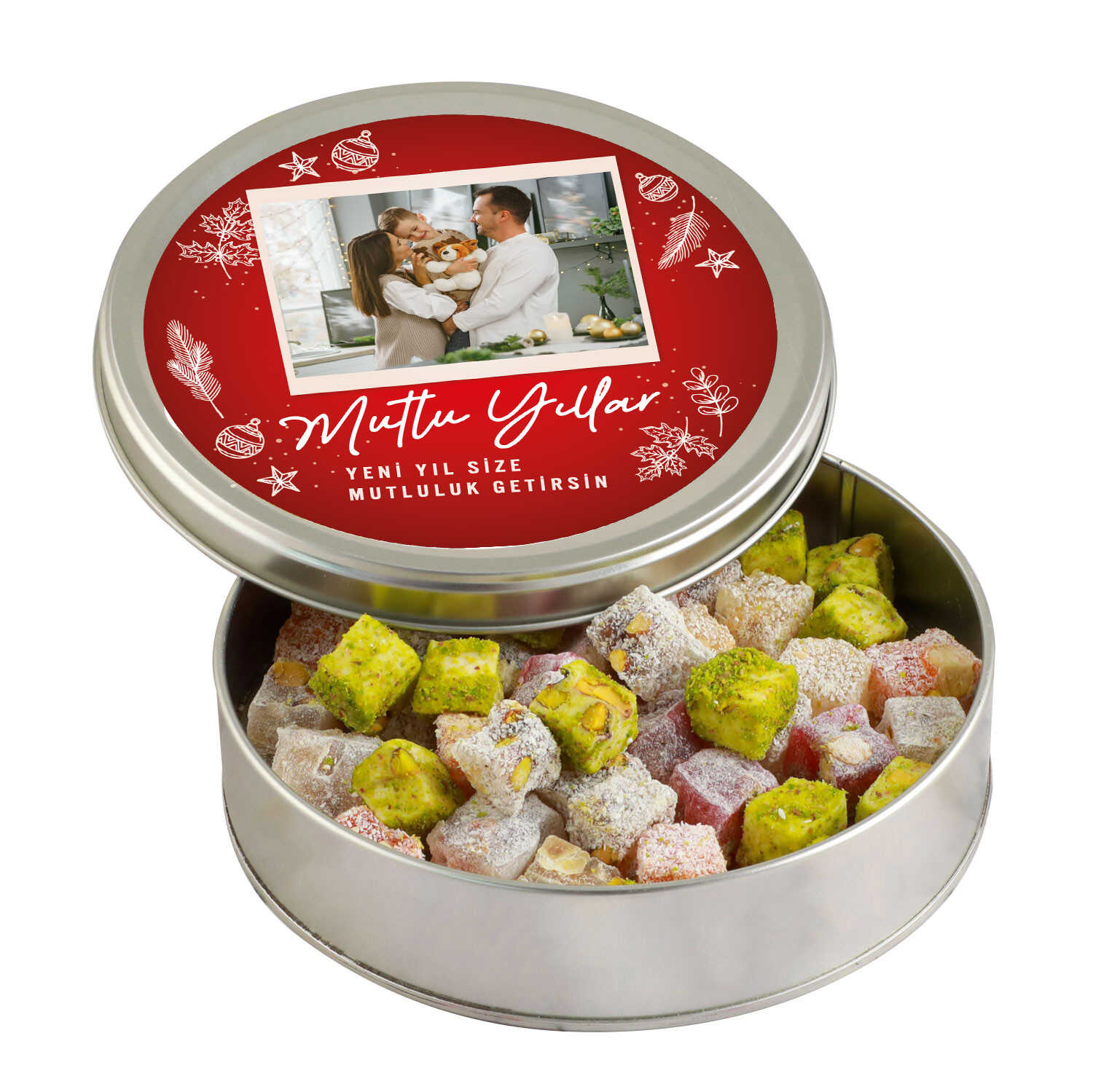Kendi Fotoğrafınızla Yılbaşı Hediyesi Çifte Kavrulmuş Lokum (Metal Yuvarlak Kutu) 300g